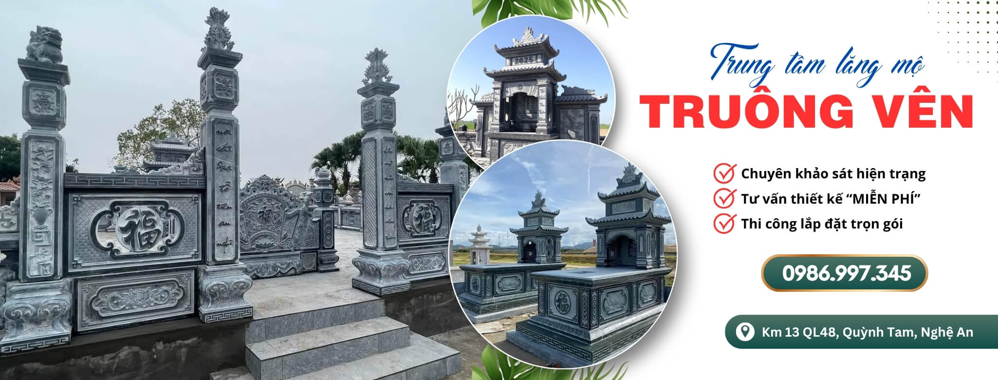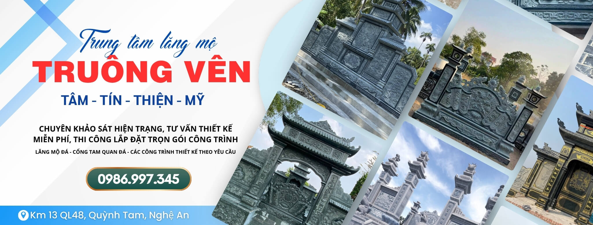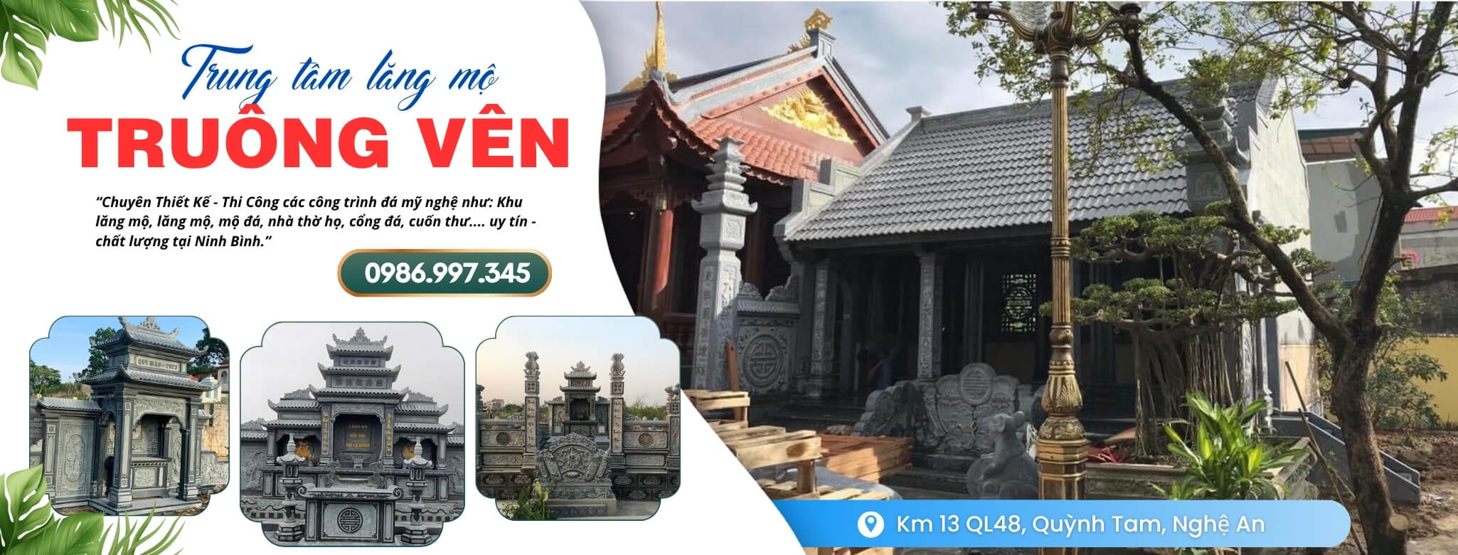 TRUNG TÂM LĂNG MỘ TRUÔNG VÊN là cơ sở đá mỹ nghệ tại Km 13 QL48, Quỳnh Tam, Nghệ An với nhiều năm trong lĩnh vực thiết kế thi công, trùng tu, làm mới các công trình đá mỹ nghệ cho khu lăng mộ, đền, đình, chùa, biệt thự, nhà thờ …, cung cấp: tượng đá, con giống đá….và các công trình đá mỹ nghệ trang trí theo yêu cầu.